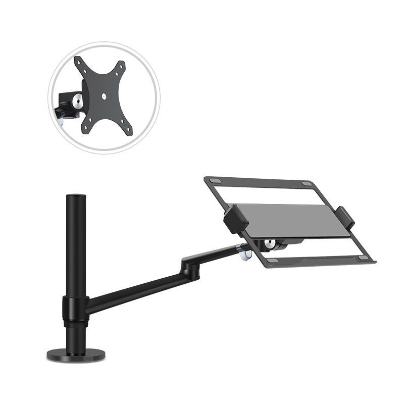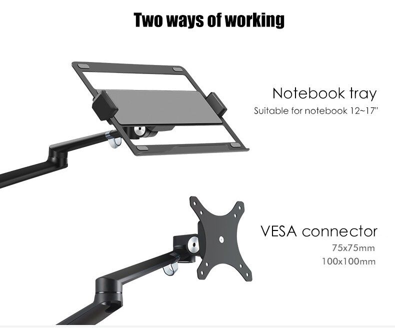 1. This laptop monitor bracket has two installation methods: it can be installed with a laptop tray, which is suitable for 12-17 inch laptops; it can also be installed with VESA connectors, which supports VESA displays of 75*75,100*100mm;