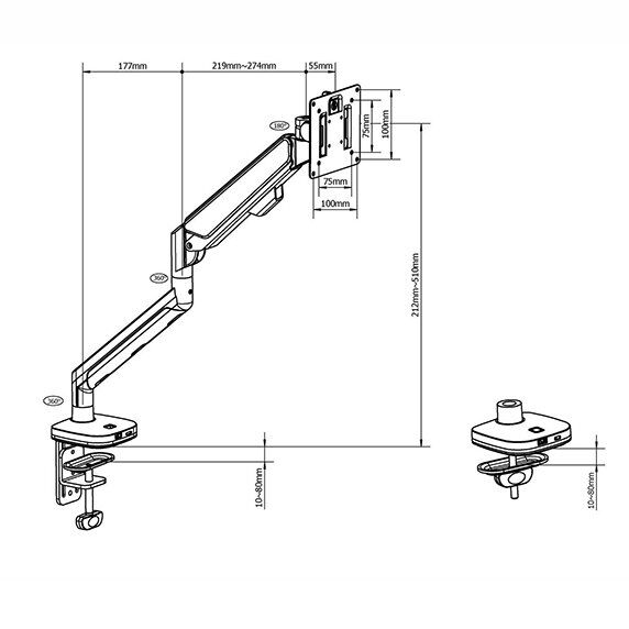 7. There are two installation methods for this single-arm gas spring monitor stand: clamping and grommet. The clamping and the grommetrequires the desktop thickness to be between 1-8cm;